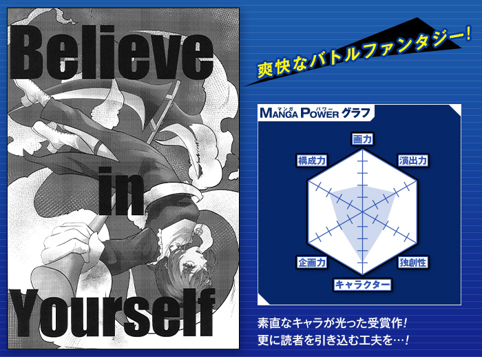 タイトル、ダブルミーニングですね。うまい!“パッと見の画力”は低いのですが、“コマごとに適切な絵を描く力”が高いので、読みづらさを感じないのが凄い。構成力も高く、ページ数に対する展開の数も適切で、ちゃんとまとまっています。ただ、色んなことを器用にこなしている反面、突出した点がないとも言える。ファンを獲得する段階に進むには、“突き抜けた何か”が必要なので、ご自身の内なる情熱を探ってみて欲しいです。