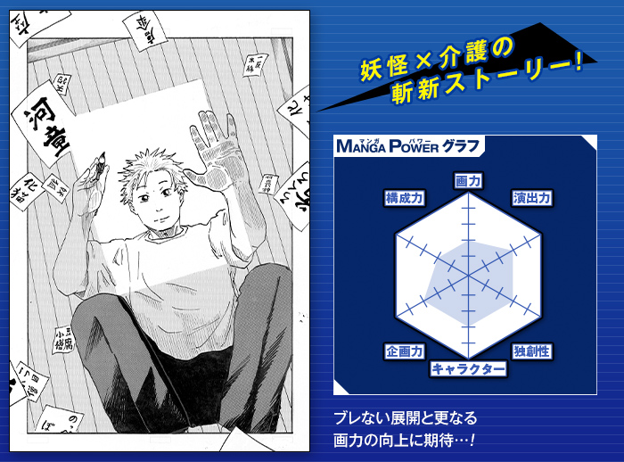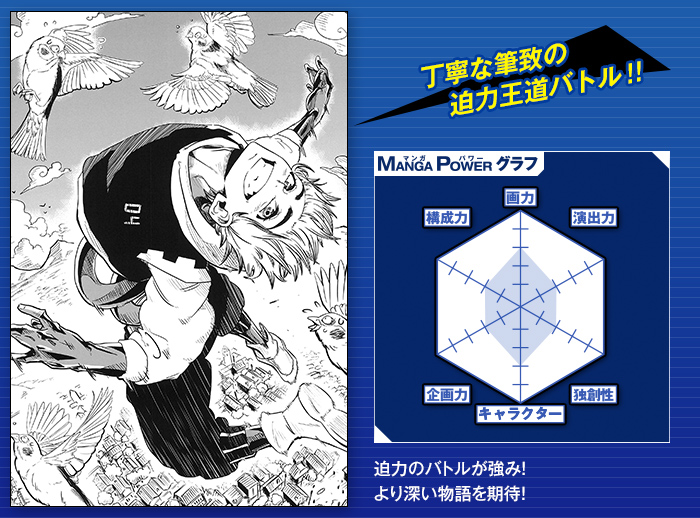 まず、ト書きがひとつもないことに驚きました。“派旬”が何なのか、見ていればわかる。絵やキャラ同士のやりとりだけで、世界観や設定を説明できているのは新人のレベルを超えています。それぞれ価値観の異なるキャラクターを、3人登場させられているのも凄い。レベルの高いことをやっていると思う反面、キャラクターの感情が伝わりづらいのが惜しい。前述の高い技術を伝え切れていないと感じる。表情やリアクションの幅を広げたり、盛り上げ演出の工夫が必要かなと思います。ラストの余韻も弱い。あと、どのフキダシが誰のセリフかわからない点も多かった。描き文字が絵に埋もれている。そもそもタイトルの「oracion」もわかりづらい。“わかる人”だけでなく、より多くの人に伝わるように工夫してみて欲しいです。